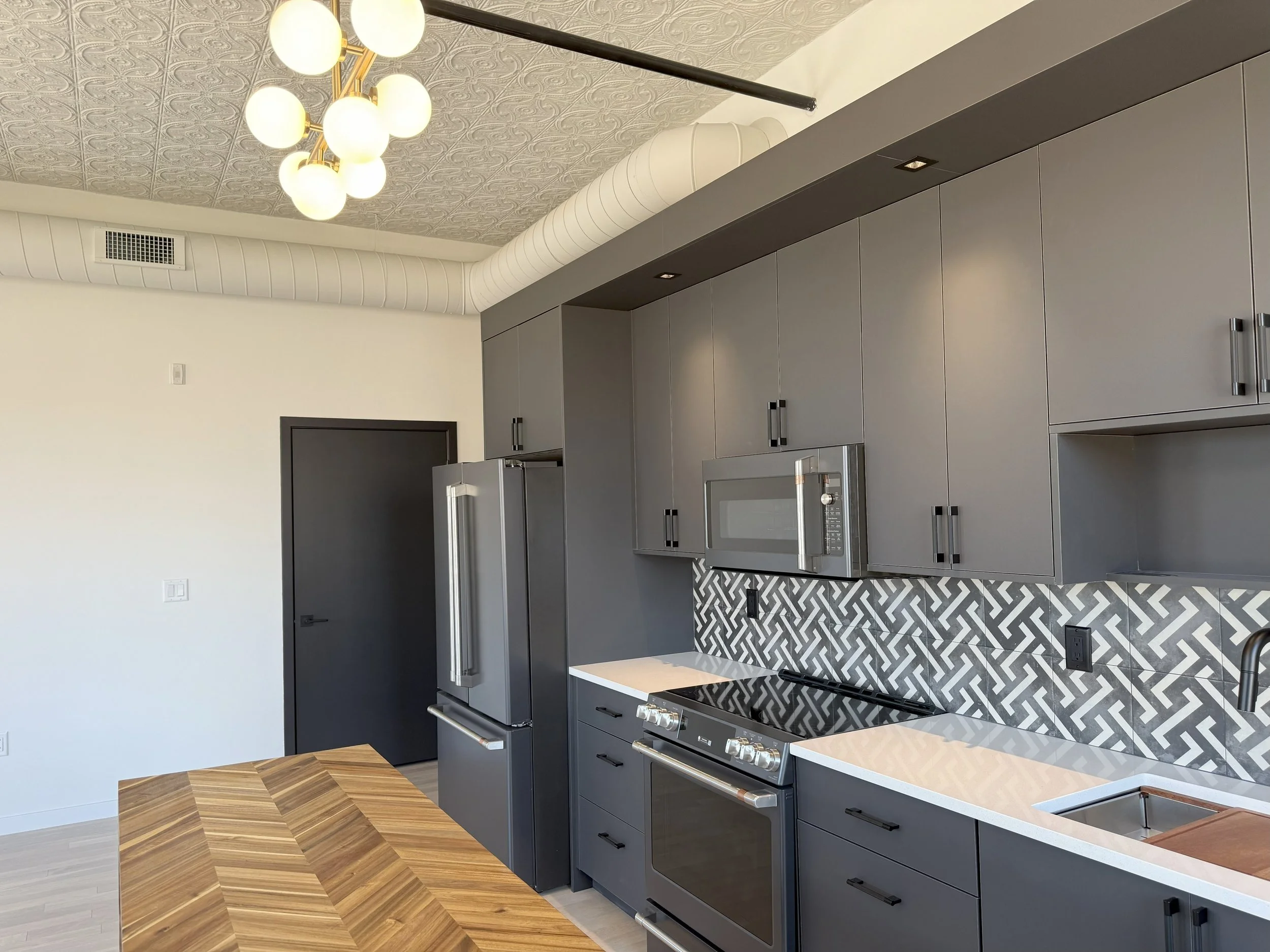 Modern luxury living with original metal ceilings, exposed architectural details, new windows, and custom cabinetry. High-end finishes include Visual Comfort lighting, Kohler fixtures, designer tile, and GE Café appliances. The unit also features in-unit laundry with a washer and dryer, plus a fully equipped kitchen with a microwave, dishwasher, refrigerator, range, and a mobile kitchen island with seating.